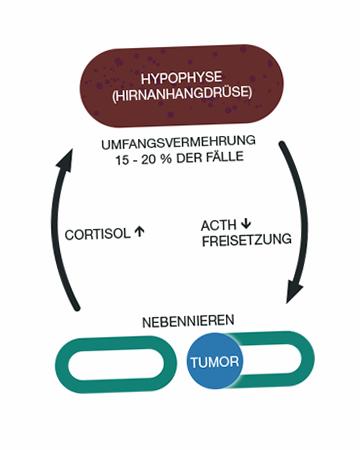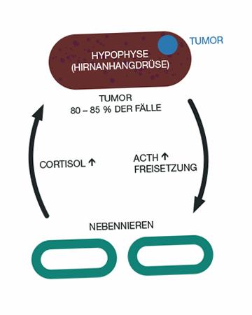 Die Ursache eines Cushing-Syndroms liegt oft an einer gutartigen Umfangsvermehrung der Hirnanhangdrüse (etwa 80 bis 85 % der Fälle).